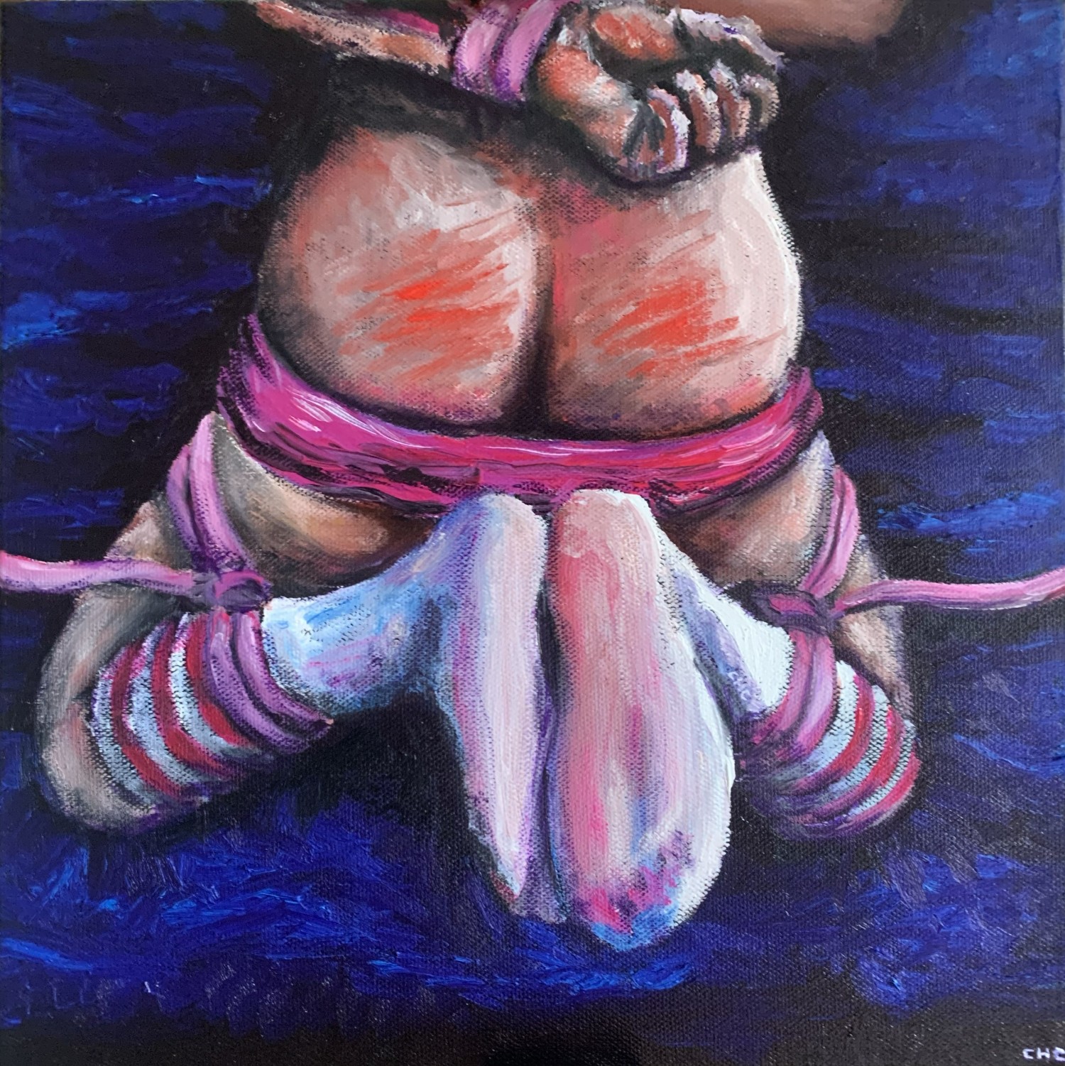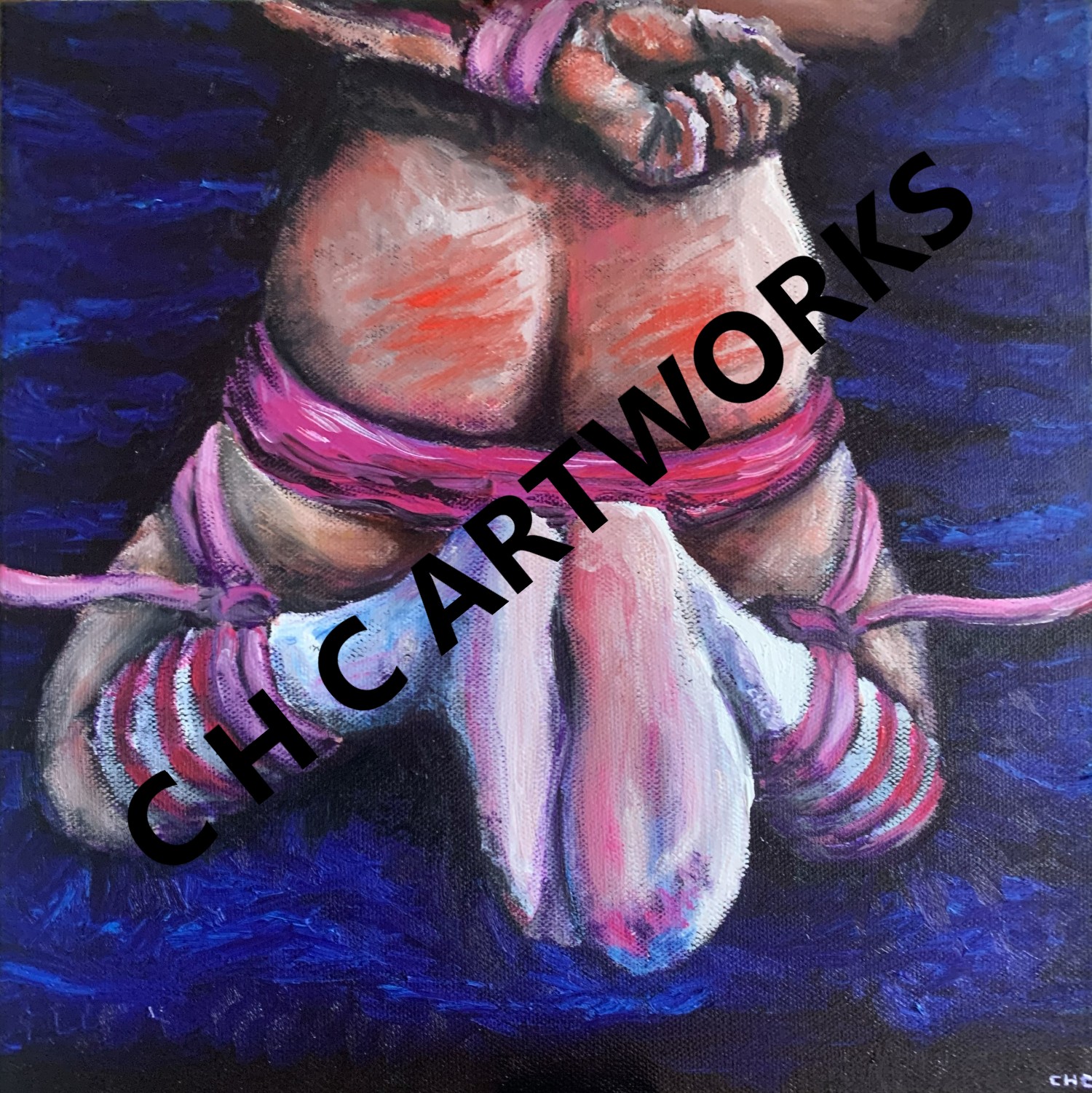 I was very pleased with how this worked out - we found a balance between my style and what he wanted. The impact marks and the pink ribbons for bondage were the biggest change from the source material, and definitely the strongest elements in the final painting. It was a fun challenge to work in new colours and themes than my usual.